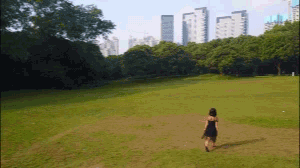 把妹子拖動到畫面右下角,既可以把妹子跳動的姿勢拍明白,又可以拍到遠處的草地、綠樹和修建,這才是咱們想要的畫面。